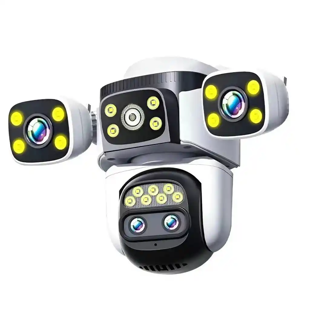Esta revolucionaria cámara de seguridad inteligente redefine la vigilancia exterior al integrar un sistema único de 4 lentes que permite visualizar hasta 4 pantallas simultáneas desde tu celular, eliminando por completo los puntos ciegos. Gracias a su potente Zoom híbrido de 10X y su capacidad de rotación PTZ (355° horizontal y 90° vertical), podrás capturar detalles lejanos con una nitidez asombrosa, mientras que su tecnología de seguimiento humano mediante IA asegura que ningún movimiento pase desapercibido. Diseñada para resistir climas extremos, ofrece visión nocturna a todo color mediante potentes reflectores LED, audio bidireccional para comunicación en tiempo real y un sistema de alarma de intrusión con notificaciones push inmediatas. Es la solución de seguridad más completa y robusta, permitiendo un monitoreo profesional 24/7 con almacenamiento dual en tarjeta SD o nube, todo gestionado de forma sencilla desde una aplicación móvil. Ficha Técnica Resolución: Full HD 4K (Combinada) Número de lentes: 4 lentes independientes Zoom: Híbrido 10X Conectividad: WiFi 6 de doble banda y puerto LAN RJ45 Movimiento: Horizontal 355 grados / Vertical 90 grados Visión Nocturna: Dual (Infrarroja y LED a color inteligente) Audio: Bidireccional (Micrófono y altavoz integrados) Almacenamiento: Soporta tarjeta Micro SD hasta 128GB (No incluida) y Nube Resistencia al clima: Certificación IP66 (Impermeable y a prueba de polvo) Alimentación: 12V / 2A (Adaptador incluido) Voltaje de operación: 110V - 240V Funciones IA: Detección de movimiento, seguimiento de humanos y alertas de área configurables Dimensiones aproximadas: 20 cm x 18 cm x 11 cm Compatibilidad: Android / iOS mediante App Términos de garantía:Para defectos de fábrica o retractos: Por favor revise el producto apenas lo reciba y antes de usarlo. No aplican ley de retracto o defectos de fábrica luego de usar el producto. Se manejan máximo 5 días para reportar defectos de fábrica (por ejemplo, producto funciona mal, piezas faltantes, rotas, etc). Para hacer efectiva la devolución el producto debe devolverse con el empaque original, el cual debe estar en buen estado, incluir todos los documentos y las partes completas y sin daños.
