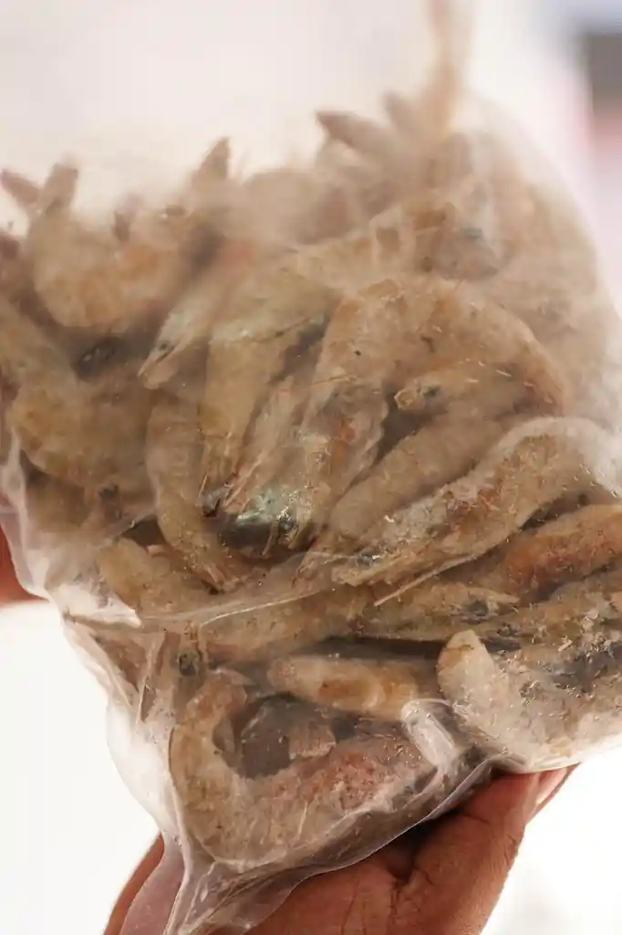 Camarón con cabeza y concha, talla surtida, glaseo 5%. Empacado en bolsas transparentes x 1 kg.