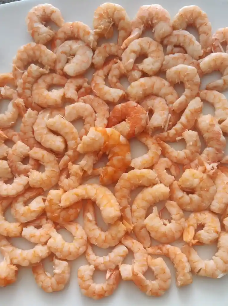 Camarón Guajiro, precocido, desvenado, presentación por 250 Gramos. Incluye conchas (Cabezas) para preparar bases.