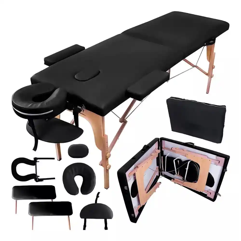 La mesa está construida con madera europea para una construcción sólida. Esta camilla de masaje incluye un reposacabezas de plástico ajustable, un cojín facial, soportes laterales para los brazos, un reposabrazos delantero y una bolsa para su transporte. La cubierta de la camilla y la espuma están hechas de tapicería de cuero de PVC resistente al agua con 4 cm de espuma multicapa para mayor comodidad. La mesa se monta fácilmente y se pliega para su almacenamiento o traslado. Resistente - soporta hasta 120 kg máximo. · Cómoda gracias a su diseño ergonómico · Tapicería de cuero de PVC resistente al agua · 4cm de espuma multicapa de densidad 20 Diseño elegante y fino. Materiales de alta calidad con resistencia al agua y gran durabilidad gracias a su madera europea. Versatilidad en el montaje y plegado para un almacenamiento sencillo. Ajuste de la mesa con 11 agujeros y 9 niveles de ajuste de altura de 61 a 86cm.