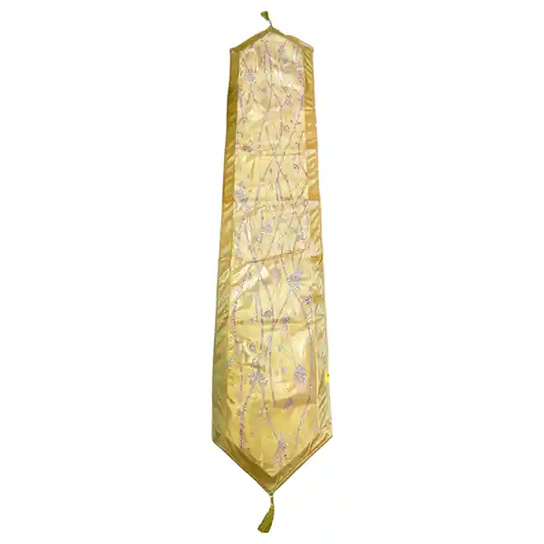 Centro de mesa con colores dorados y bordados llamativos. 33X129X0.5CM