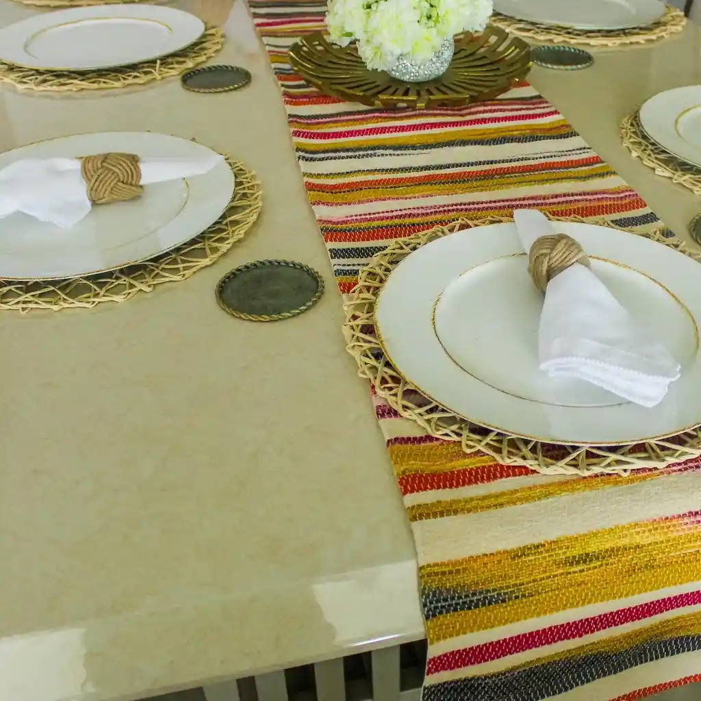 Camino de mesa Antonia. Diseño artesanal. 66% algodón. 34% acrílico. Listas de colores llamativas que le dan un toque especial a tu mesa. Ideal para mesas cuadradas o redondas de 4 o 6 puestos.