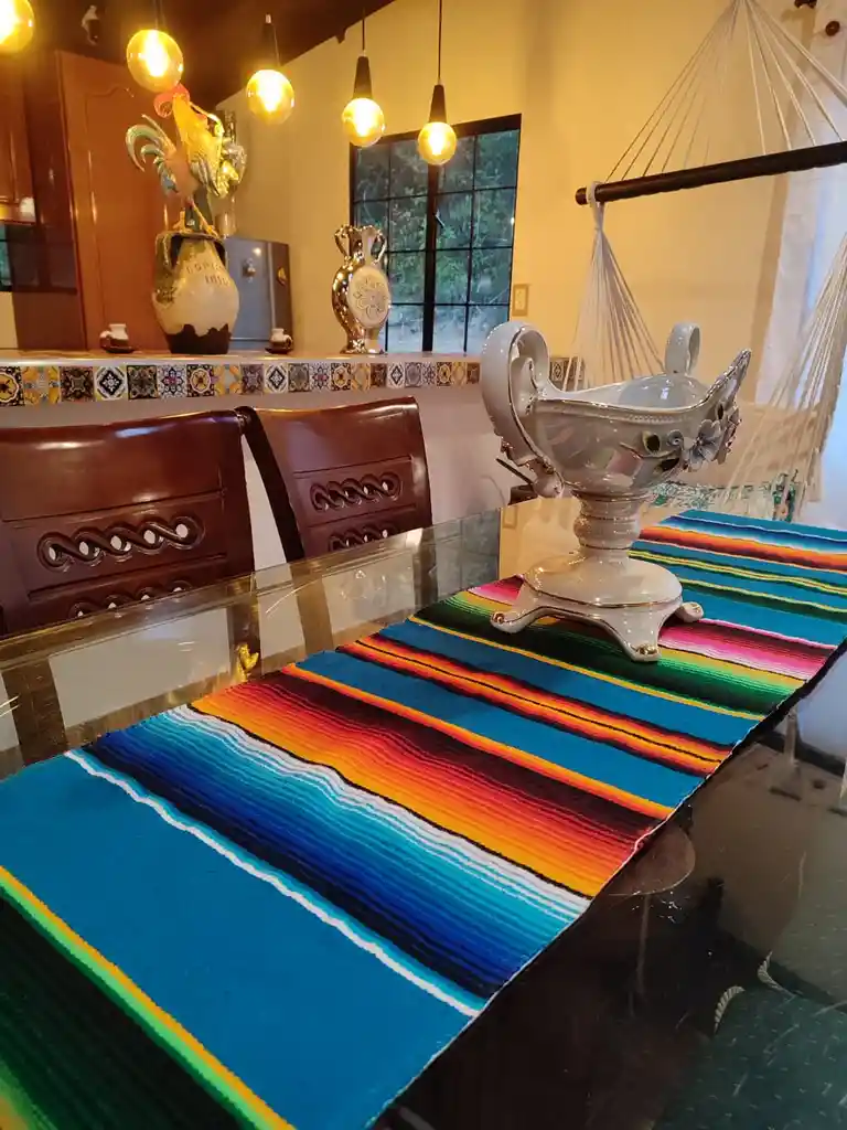 "Largo: 2.10 cm Ancho: 35 cm Tejido, hecho por manos tlaxcaltecas. ✨Para uso como camino de mesa, pie de cama o para decorar, representa la identidad mexicana, por su colorido, diseño y textura, significa el ciclo del día, el amanecer/ atardecer del desierto; pero también tiene relación con el tiempo, la vida y la muerte, el cielo y la tierra. Pregunta la disponibilidad de colores / el color se refiere al que predomina en la pieza💁🏻♀️"