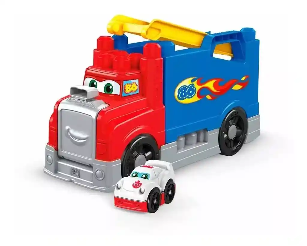 INCLUYE: 16 piezas Medidas: 41 cm ancho x 28 cm alto 14cm. Camión de competición construible con ruedas que giran de verdad. ¡Incluye un coche de carreras fácil de construir que emite cinco sonidos de competición! El camión se puede reconstruir en forma de pista de carreras acrobática. Viene con ocho bloques de construcción y tres tramos de pista que se pueden montar de diferentes maneras. El práctico camión permite guardar en su interior todos los bloques de construcción y el coche de carreras. Un juguete perfecto para manitas pequeñas.
