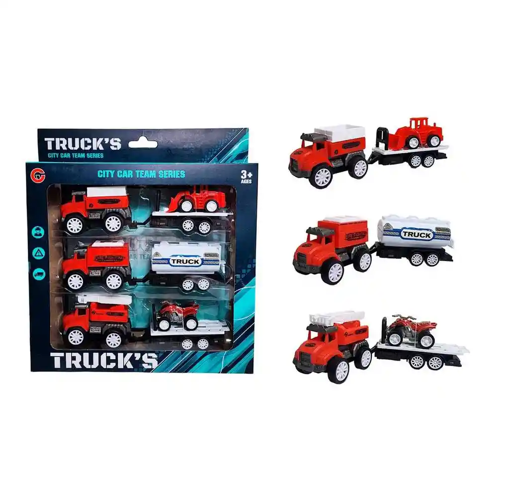 ¡Ponte al volante y prepárate para las misiones de transporte más grandes con este increíble set de camiones con remolque! Este completo paquete incluye tres robustos camiones de bomberos, cada uno con su propio tráiler especializado para una máxima jugabilidad: transporta un tractor, un camión cisterna o una cuatrimoto de rescate en sus diferentes plataformas. La verdadera diversión comienza con la interacción, ya que los remolques se pueden enganchar y desenganchar, y los vehículos adicionales se cargan y descargan, fomentando la coordinación y el juego de simulación. Ideal para crear complejas operaciones logísticas y emocionantes historias de rescate, este set convierte a los pequeños en los jefes de su propia compañía de transporte, garantizando horas de entretenimiento creativo. Ficha Técnica: Material: Plástico ABS Dimensiones Del Vehículo : 16 cm x 5 cm x 3 cm Apto para: + 3 Años Referencia: 99843-60 Certificado de conformidad: CS-LCO-13233-2021S2/432 ** _Para defectos de fábrica o retractos: \_Por favor revise el producto apenas lo reciba y antes de usarlo. No aplican ley de retracto o defectos de fábrica luego de usar el producto. Se manejan máximo 5 días para reportar defectos de fábrica (por ejemplo, producto funciona mal, piezas faltantes, rotas, etc). Para hacer efectiva la devolución el producto debe devolverse con el empaque original, el cual debe estar en buen estado, incluir todos los documentos y las partes completas y sin daños.