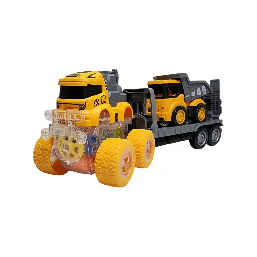 ¡Es hora de mover la carga pesada con este formidable set de transporte de construcción! Un poderoso camión-grúa amarillo, con ruedas gigantes, lidera la operación luciendo un espectacular chasis transparente que revela un show de engranajes de colores y luces en pleno movimiento. Engancha su remolque para transportar el robusto camión volqueta a la siguiente gran obra. Al encenderlo, el vehículo principal cobra vida y avanza con fuerza por sí solo, mostrando su fascinante mecanismo interno mientras arrastra el equipo pesado. Este set 3 en 1 es la combinación perfecta de acción, maquinaria y juego interactivo, garantizando horas de diversión para los pequeños constructores que sueñan con grandes proyectos. Ficha Técnica: Material: Plástico ABS Dimensiones Del Vehículo : 27 cm x 10 cm x 8 cm Apto para: + 3 Años Referencia: YM-1102T1 Certificado de conformidad: CS-LCO-13233-2021S2/432 ** _Para defectos de fábrica o retractos: \_Por favor revise el producto apenas lo reciba y antes de usarlo. No aplican ley de retracto o defectos de fábrica luego de usar el producto. Se manejan máximo 5 días para reportar defectos de fábrica (por ejemplo, producto funciona mal, piezas faltantes, rotas, etc). Para hacer efectiva la devolución el producto debe devolverse con el empaque original, el cual debe estar en buen estado, incluir todos los documentos y las partes completas y sin daños.