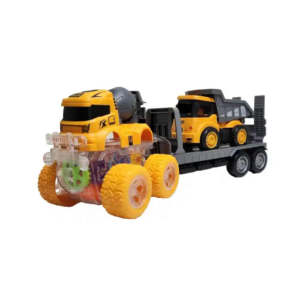 ¡Es hora de mover la carga pesada con este formidable set de transporte de construcción! Un poderoso camión-grúa amarillo, con ruedas gigantes, lidera la operación luciendo un espectacular chasis transparente que revela un show de engranajes de colores y luces en pleno movimiento. Engancha su remolque para transportar el robusto camión volqueta a la siguiente gran obra. Al encenderlo, el vehículo principal cobra vida y avanza con fuerza por sí solo, mostrando su fascinante mecanismo interno mientras arrastra el equipo pesado. Este set 3 en 1 es la combinación perfecta de acción, maquinaria y juego interactivo, garantizando horas de diversión para los pequeños constructores que sueñan con grandes proyectos. Ficha Técnica: Material: Plástico ABS Dimensiones Del Vehículo : 27 cm x 10 cm x 8 cm Apto para: + 3 Años Referencia: YM-1102T1 Certificado de conformidad: CS-LCO-13233-2021S2/432 ** _Para defectos de fábrica o retractos: \_Por favor revise el producto apenas lo reciba y antes de usarlo. No aplican ley de retracto o defectos de fábrica luego de usar el producto. Se manejan máximo 5 días para reportar defectos de fábrica (por ejemplo, producto funciona mal, piezas faltantes, rotas, etc). Para hacer efectiva la devolución el producto debe devolverse con el empaque original, el cual debe estar en buen estado, incluir todos los documentos y las partes completas y sin daños.