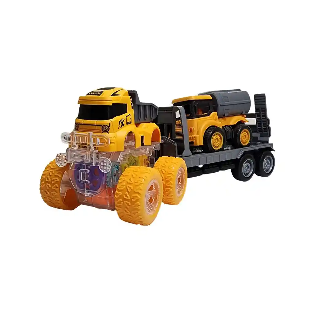 ¡Es hora de mover la carga pesada con este formidable set de transporte de construcción! Un poderoso camión-grúa amarillo, con ruedas gigantes, lidera la operación luciendo un espectacular chasis transparente que revela un show de engranajes de colores y luces en pleno movimiento. Engancha su remolque para transportar el robusto camión volqueta a la siguiente gran obra. Al encenderlo, el vehículo principal cobra vida y avanza con fuerza por sí solo, mostrando su fascinante mecanismo interno mientras arrastra el equipo pesado. Este set 3 en 1 es la combinación perfecta de acción, maquinaria y juego interactivo, garantizando horas de diversión para los pequeños constructores que sueñan con grandes proyectos. Ficha Técnica: Material: Plástico ABS Dimensiones Del Vehículo : 27 cm x 10 cm x 8 cm Apto para: + 3 Años Referencia: YM-1102T1 Certificado de conformidad: CS-LCO-13233-2021S2/432 ** _Para defectos de fábrica o retractos: \_Por favor revise el producto apenas lo reciba y antes de usarlo. No aplican ley de retracto o defectos de fábrica luego de usar el producto. Se manejan máximo 5 días para reportar defectos de fábrica (por ejemplo, producto funciona mal, piezas faltantes, rotas, etc). Para hacer efectiva la devolución el producto debe devolverse con el empaque original, el cual debe estar en buen estado, incluir todos los documentos y las partes completas y sin daños.