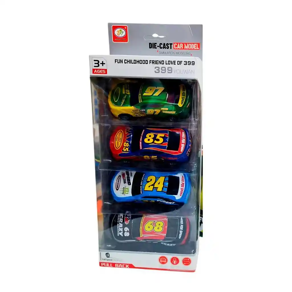¡Pilotos a sus autos! Prepárate para la máxima velocidad y la emoción de la pista con este increíble set de autos de carrera. Este paquete incluye cuatro bólidos de metal (die-cast), cada uno con un diseño único, vibrantes colores y números de competencia, listos para formar tu propia escudería. Siente la potencia en tus manos con su poderoso mecanismo de retrofricción (pull-back): simplemente arrástralos hacia atrás, suéltalos y míralos dispararse en una carrera trepidante hacia la línea de meta. Gracias a su robusta construcción de metal, están diseñados para soportar las carreras más intensas y garantizar horas de competencia y diversión, convirtiéndose en el regalo definitivo para los pequeños campeones del volante. Ficha Técnica: Material: Plástico ABS Dimensiones Del Vehículo : 10 cm x 4 cm x 3 cm Apto para: + 3 Años Referencia: 123-57k4 Certificado de conformidad: CS-LCO-13233-2021S2/432 ** _Para defectos de fábrica o retractos: \_Por favor revise el producto apenas lo reciba y antes de usarlo. No aplican ley de retracto o defectos de fábrica luego de usar el producto. Se manejan máximo 5 días para reportar defectos de fábrica (por ejemplo, producto funciona mal, piezas faltantes, rotas, etc). Para hacer efectiva la devolución el producto debe devolverse con el empaque original, el cual debe estar en buen estado, incluir todos los documentos y las partes completas y sin daños.