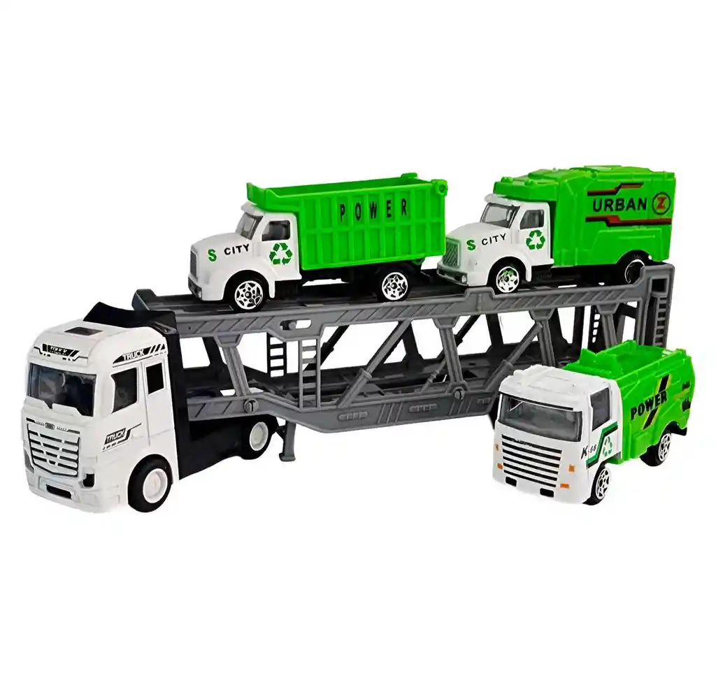 Camión porta vehículos de reciclaje con diseño en color blanco y gris que incluye tres camiones verdes de recolección de basura con diferentes estilos, ideal para fomentar el juego de roles y la conciencia ambiental. Su plataforma de doble nivel permite cargar y descargar fácilmente los vehículos, estimulando la creatividad y la coordinación motriz de niñas y niños a partir de 3 años mientras recrean divertidas jornadas de limpieza y cuidado del medio ambiente. Ficha Técnica: Material : Plástico ABS Edad Apto + 3 años Dimensiones del empaque : 31 cm x 16 cm x 4 cm Certificado de conformidad: E5-0359-2021 Referencia: TQ66E-12 ** _Para defectos de fábrica o retractos: \_Por favor revise el producto apenas lo reciba y antes de usarlo. No aplican ley de retracto o defectos de fábrica luego de usar el producto. Se manejan máximo 5 días para reportar defectos de fábrica (por ejemplo, producto funciona mal, piezas faltantes, rotas, etc). Para hacer efectiva la devolución el producto debe devolverse con el empaque original, el cual debe estar en buen estado, incluir todos los documentos y las partes completas y sin daños.