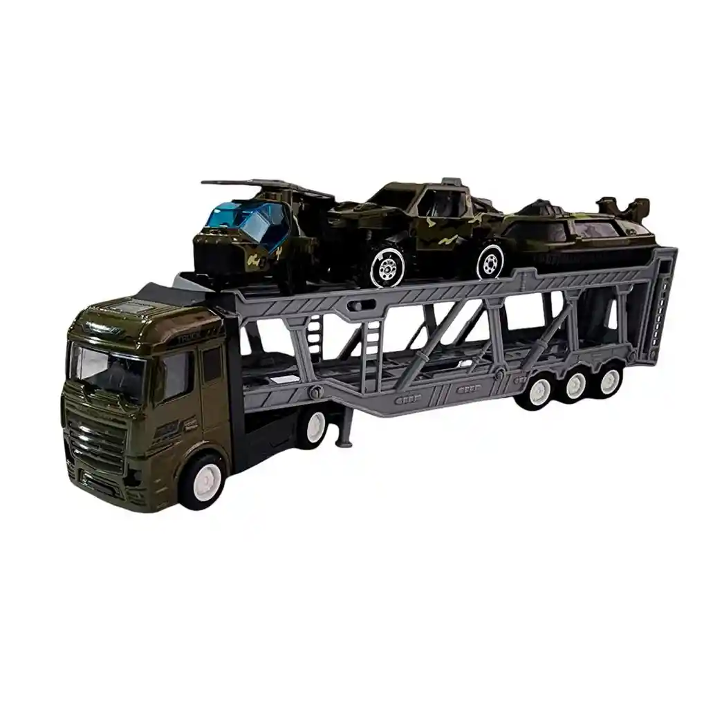 Este set de transporte militar incluye un camión porta vehículos de doble nivel acompañado de tres vehículos en miniatura: un helicóptero, un bote y un carro todoterreno, todos con diseño de camuflaje. Fabricado con detalles realistas, permite cargar y descargar los vehículos fácilmente, fomentando el juego imaginativo y las aventuras de acción. Ideal para niñas y niños a partir de 3 años, es perfecto para recrear misiones y estimular la creatividad mientras se disfruta de horas de diversión. Ficha Técnica: Material : Plástico ABS Edad Apto + 3 años Dimensiones del empaque : 31 cm x 16 cm x 4 cm Certificado de conformidad: E5-0359-2021 Referencia: TQ66E-11 ** _Para defectos de fábrica o retractos: \_Por favor revise el producto apenas lo reciba y antes de usarlo. No aplican ley de retracto o defectos de fábrica luego de usar el producto. Se manejan máximo 5 días para reportar defectos de fábrica (por ejemplo, producto funciona mal, piezas faltantes, rotas, etc). Para hacer efectiva la devolución el producto debe devolverse con el empaque original, el cual debe estar en buen estado, incluir todos los documentos y las partes completas y sin daños.