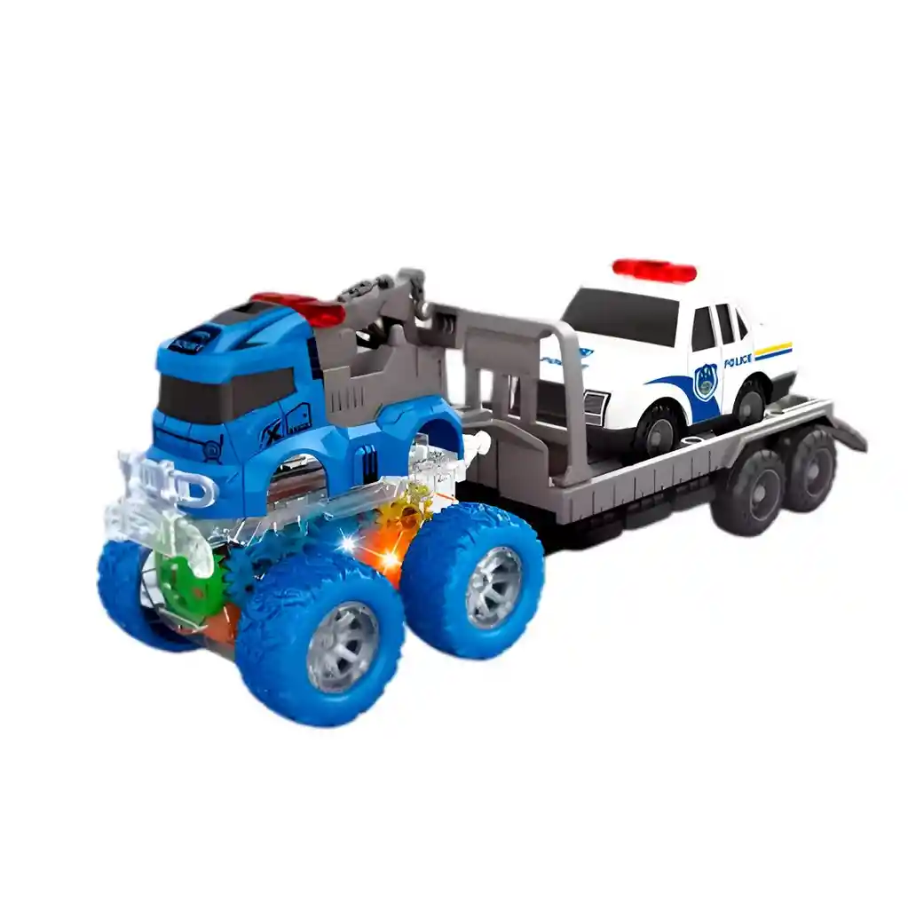 ¡Prepárate para la misión de rescate más espectacular con esta increíble grúa monster truck! Este poderoso camión no solo transporta con seguridad al coche de policía incluido, sino que también ofrece un fascinante show de luces y acción. Su chasis transparente revela un sistema de engranajes de colores que giran y se mueven mientras el vehículo avanza, iluminado por vibrantes luces intermitentes. Simplemente enciéndelo y mira cómo cobra vida, rodando con sus enormes ruedas para superar cualquier obstáculo. Es el juguete perfecto para los pequeños amantes de la acción, combinando la fuerza de un monster truck con la emoción de las historias de policías para garantizar horas de juego creativo y aventuras a toda velocidad. Ficha Técnica: Material: Plástico ABS Dimensiones Del Vehículo : 27 cm x 10 cm x 8 cm Apto para: + 3 Años Referencia: YM-1100T1 Certificado de conformidad: CS-LCO-13233-2021S2/432 ** _Para defectos de fábrica o retractos: \_Por favor revise el producto apenas lo reciba y antes de usarlo. No aplican ley de retracto o defectos de fábrica luego de usar el producto. Se manejan máximo 5 días para reportar defectos de fábrica (por ejemplo, producto funciona mal, piezas faltantes, rotas, etc). Para hacer efectiva la devolución el producto debe devolverse con el empaque original, el cual debe estar en buen estado, incluir todos los documentos y las partes completas y sin daños.