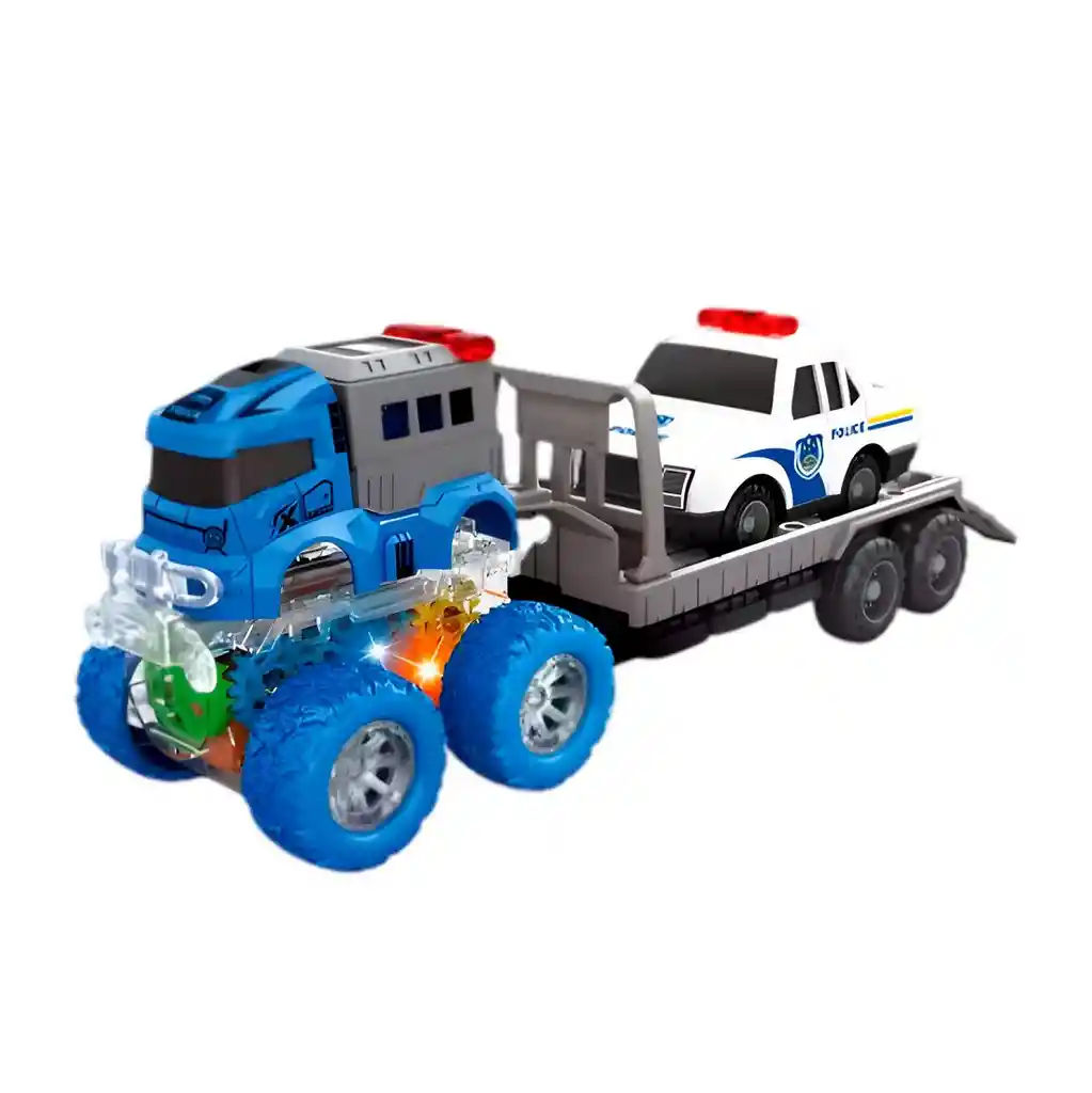 ¡Prepárate para la misión de rescate más espectacular con esta increíble grúa monster truck! Este poderoso camión no solo transporta con seguridad al coche de policía incluido, sino que también ofrece un fascinante show de luces y acción. Su chasis transparente revela un sistema de engranajes de colores que giran y se mueven mientras el vehículo avanza, iluminado por vibrantes luces intermitentes. Simplemente enciéndelo y mira cómo cobra vida, rodando con sus enormes ruedas para superar cualquier obstáculo. Es el juguete perfecto para los pequeños amantes de la acción, combinando la fuerza de un monster truck con la emoción de las historias de policías para garantizar horas de juego creativo y aventuras a toda velocidad. Ficha Técnica: Material: Plástico ABS Dimensiones Del Vehículo : 27 cm x 10 cm x 8 cm Apto para: + 3 Años Referencia: YM-1100T1 Certificado de conformidad: CS-LCO-13233-2021S2/432 ** _Para defectos de fábrica o retractos: \_Por favor revise el producto apenas lo reciba y antes de usarlo. No aplican ley de retracto o defectos de fábrica luego de usar el producto. Se manejan máximo 5 días para reportar defectos de fábrica (por ejemplo, producto funciona mal, piezas faltantes, rotas, etc). Para hacer efectiva la devolución el producto debe devolverse con el empaque original, el cual debe estar en buen estado, incluir todos los documentos y las partes completas y sin daños.