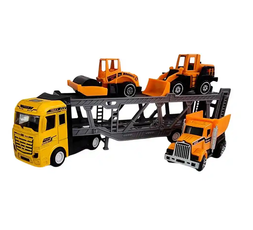 Camión porta vehículos de construcción con diseño en color amarillo y gris, que incluye tres mini vehículos de obra: aplanadora, cargador frontal y volqueta, perfectos para recrear escenarios de trabajo pesado. Su plataforma de doble nivel facilita el transporte y descarga de los vehículos, incentivando la imaginación, la coordinación y el juego de roles en niñas y niños a partir de 3 años, mientras simulan emocionantes jornadas en la construcción. Ficha Técnica: Material : Plástico ABS Edad Apto + 3 años Dimensiones del empaque : 31 cm x 16 cm x 4 cm Certificado de conformidad: E5-0359-2021 Referencia: TQ66E-9 ** _Para defectos de fábrica o retractos: \_Por favor revise el producto apenas lo reciba y antes de usarlo. No aplican ley de retracto o defectos de fábrica luego de usar el producto. Se manejan máximo 5 días para reportar defectos de fábrica (por ejemplo, producto funciona mal, piezas faltantes, rotas, etc). Para hacer efectiva la devolución el producto debe devolverse con el empaque original, el cual debe estar en buen estado, incluir todos los documentos y las partes completas y sin daños.