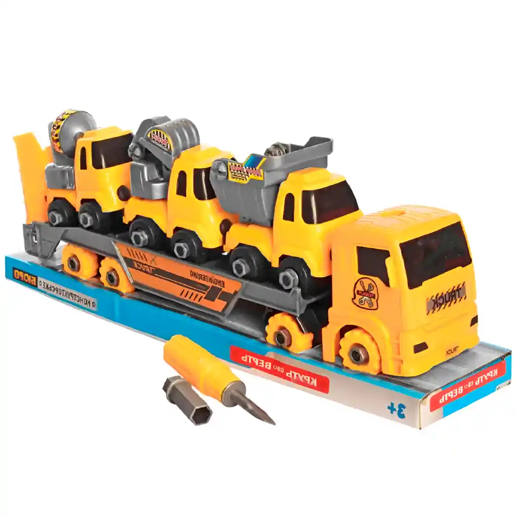 El Camión Niñera Porta Vehículos con Herramientas de Ruedas Libres es perfecto para los pequeños constructores que quieren vivir grandes aventuras. Su misión será transportar los vehículos hasta la obra y colaborar en la construcción, desarrollando su imaginación y habilidades. El set incluye un destornillador con puntas intercambiables y una llave de plástico, que permiten desarmar y montar los camiones al quitar las ruedas y tornillos. Este juguete de piezas armables ayuda a mejorar la memoria y la destreza manual de los niños mientras se divierten. Recomendado para mayores de 3 años, viene en una caja sellada y lista para regalar. Ficha Técnica: Material : Plástico ABS no tóxico, inodoro e inofensivo Edad Recomendada : + 3 Años Medidas del Camión : 40 cm x 10 cm Medidas de los Vehículos : 10 cm x 8 cm Certificado de conformidad: E5-0359-2021 Referencia: C1897 Términos de garantía: Para defectos de fábrica o retractos: Por favor revise el producto apenas lo reciba y antes de usarlo. No aplican ley de retracto o defectos de fábrica luego de usar el producto. Se manejan máximo 5 días para reportar defectos de fábrica (por ejemplo, producto funciona mal, piezas faltantes, rotas, etc). Para hacer efectiva la devolución el producto debe devolverse con el empaque original, el cual debe estar en buen estado, incluir todos los documentos y las partes completas y sin daños.