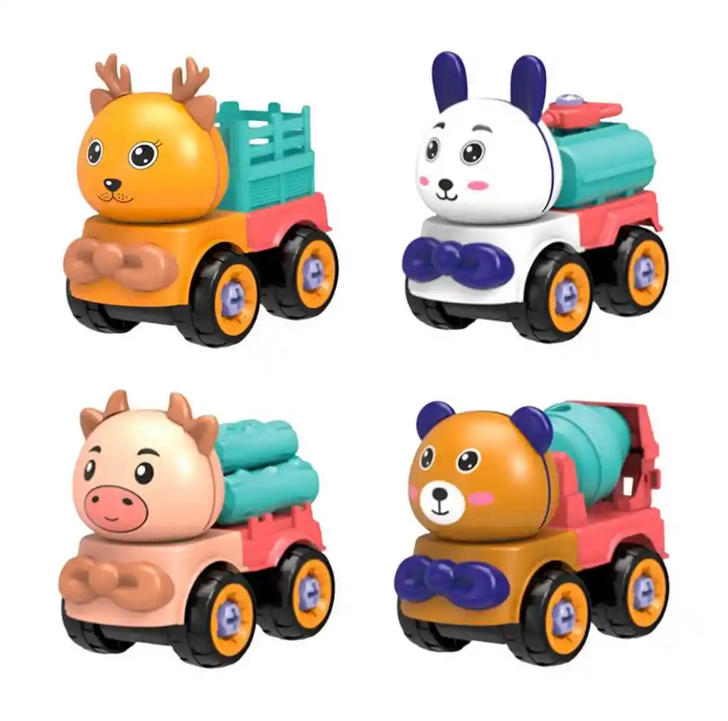 ¡Prepárate para una adorable aventura de construcción y juego con nuestro encantador set de 4 camiones de animales armables! Este kit único invita a los pequeños ingenieros a dar vida a su propia flotilla de simpáticos amigos: un ciervo granjero, una vaquita maderera, un osito mezclador y un conejito cisterna. Usando el destornillador y los tornillos de plástico, seguros y fáciles de manejar, los niños pueden ensamblar y desensamblar cada vehículo pieza por pieza, fomentando de manera divertida la coordinación mano-ojo, las habilidades para resolver problemas y la motricidad fina. Es el juguete ideal que combina la emoción de construir con la alegría del juego imaginativo, convirtiéndose en el regalo perfecto para mentes curiosas y manitas creativas. Ficha Técnica: Dimensiones : 11 cm x 10 cm x 6 cm Material: Plástico ABS Edad Apta : + 3 años Certificado de conformidad: SL-CS-210044 Referencia: LY030A ** _Para defectos de fábrica o retractos: \_Por favor revise el producto apenas lo reciba y antes de usarlo. No aplican ley de retracto o defectos de fábrica luego de usar el producto. Se manejan máximo 5 días para reportar defectos de fábrica (por ejemplo, producto funciona mal, piezas faltantes, rotas, etc). Para hacer efectiva la devolución el producto debe devolverse con el empaque original, el cual debe estar en buen estado, incluir todos los documentos y las partes completas y sin daños.