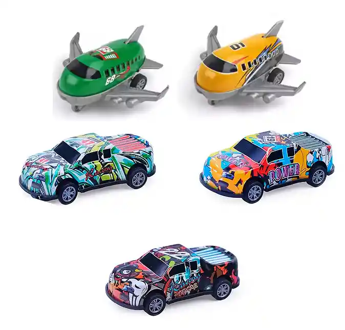 ¡Sumérgete en la diversión sin límites con nuestro set de juguetes de impulso para niños! Este emocionante conjunto incluye 3 camionetas de impulso estilo rally y 2 aviones, brindando una experiencia de juego variada y dinámica. Ideal para pequeñas aventuras sobre ruedas y en el aire, este set estimula la imaginación y promete horas de entretenimiento en movimiento. Ficha Técnica: Material: Plástico ABS No toxico Dimensiones: 10.5 cm x 5 cm x 3 cm Certificado de conformidad: CS-LCO-13233-2021S2/432 Referencia: 399-255K MODELO 352-5A ** _Para defectos de fábrica o retractos: \_Por favor revise el producto apenas lo reciba y antes de usarlo. No aplican ley de retracto o defectos de fábrica luego de usar el producto. Se manejan máximo 5 días para reportar defectos de fábrica (por ejemplo, producto funciona mal, piezas faltantes, rotas, etc). Para hacer efectiva la devolución el producto debe devolverse con el empaque original, el cual debe estar en buen estado, incluir todos los documentos y las partes completas y sin daños.