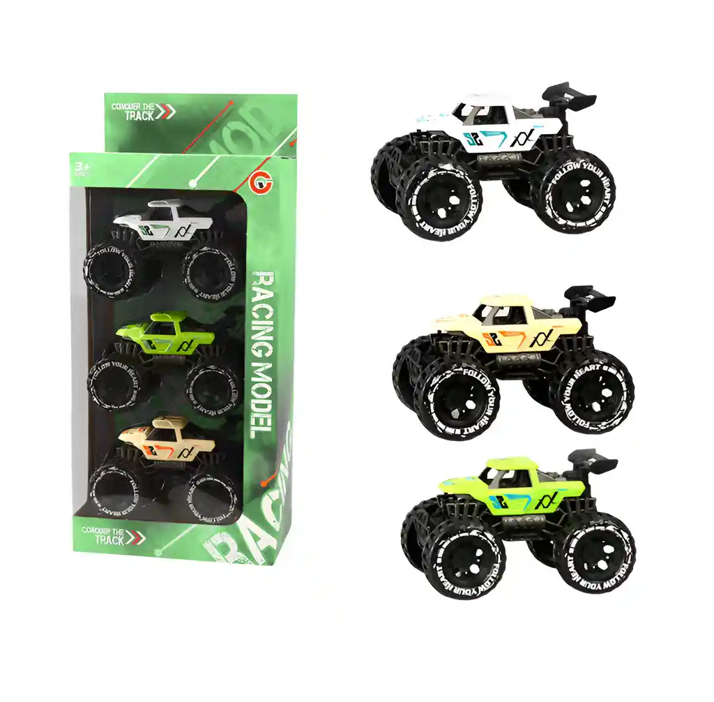 ¡Prepárate para aplastar la competencia y conquistar cualquier terreno con este increíble set de 3 Camionetas Monstruo de carreras! Este paquete de pura potencia te trae un equipo completo de vehículos todoterreno, cada uno con gigantescas ruedas de gran agarre, un diseño aerodinámico de carreras y un potente motor de fricción listo para la acción. Simplemente empújalos hacia adelante, suéltalos y mira cómo se lanzan a una velocidad imparable para realizar saltos y acrobacias espectaculares. Con tres modelos diferentes listos para competir desde que abres la caja, es el regalo perfecto para organizar tus propios campeonatos de Monster Truck, desafiar a tus amigos y desatar horas de juego rudo y lleno de adrenalina. ¡Acelera a fondo y demuestra quién es el rey de la pista! Ficha Técnica: Dimensiones del vehículo : 10 cm x 6 cm x 5 cm Material : Plástico ABS Edad recomendada: + 3 años Referencia: 9613-10 Certificado de conformidad: CS-LCO-13233-2021S2/432 ** _Para defectos de fábrica o retractos: \_Por favor revise el producto apenas lo reciba y antes de usarlo. No aplican ley de retracto o defectos de fábrica luego de usar el producto. Se manejan máximo 5 días para reportar defectos de fábrica (por ejemplo, producto funciona mal, piezas faltantes, rotas, etc). Para hacer efectiva la devolución el producto debe devolverse con el empaque original, el cual debe estar en buen estado, incluir todos los documentos y las partes completas y sin daños.