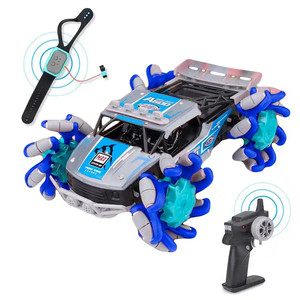 Potente camioneta a control remoto con tracción en sus 4 ruedas, lo puedes controlar de dos formas: con su manilla de sensor de gestos o con su control remoto ergonómico con tecnología 2.4GHz que emite una señal fuerte y receptiva incluso a largas distancias. Su diseño está enfocado específicamente para movimientos de alto nivel, como giros de 360°, deriva en todas las direcciones, escalada incluso en terrenos de superficies irregulares como arena, césped, asfalto gracias al diseño único de sus ruedas todoterreno. Fabricado con plástico ABS duradero y ecológico, sumado a su estructura interna lo hace inmune a golpes no inducidos por el hombre. Además cuenta con efectos musicales dinámicos e iluminación LED vibrante, que no solo lo hacen un vehículo resistente sino atractivo y único. ¡El juguete adecuado para niños y niñas que quieren divertirse en exteriores alejados de las pantallas y en busca de aventuras! El auto de acrobacias viene con una batería recargable de iones de litio de 3.7 V (incluida en el paquete). Se puede cargar completamente y proporcionar aproximadamente 30 minutos de uso continuo. Ten en cuenta que el control remoto de mano requiere dos baterías "AA" (no incluidas), y la manilla controladora sensor de gravedad requiere dos baterías "AAA" (no incluidas). ESPECIFICACIONES: - Avance, retroceso, se mueve a la izquierda y la derecha - Luces de colores, efectos musicales - Llantas adherentes al terreno - Subida con brazo oscilante - Caminar boca abajo - Giro de 360° - Caminar hacia atrás - La manilla controladora admite el control de gravedad por gestos - Distancia de control remoto y manilla controladora: Alrededor de 30 a 50 metros - Duración de batería: Alrededor de 30 a 45 minutos. - Tiempo de carga: Alrededor de 90 a 120 minutos. CARACTERÍSTICAS: 1. camioneta de acrobacias y luces LED, todoterreno a control remoto, tracción en las 4 ruedas, recargable, carro de juguete para niños, adolescentes y adultos. 2. Puede deformar su cuerpo, esto lo ayuda a esquivar obstáculos más fácilmente. 3. Se puede mover en cualquier dirección ya sea en diagonal, horizontal o vertical y de adelante a atrás, conducción y giro flexibles. Supera rápidamente todos los obstáculos. Un juguete de coche de control remoto ideal para niños y adultos. 4. Control remoto y manilla controladora de 2.4 GHz. Control remoto de larga distancia y manilla controladora de 30 a 50 metros, tecnología anti interferencia mejorada, para garantizar la diversión de explorar sin límites El paquete incluye: 1 * Carro control remoto todoterreno 1 * Control remoto 1 * Manilla controladora 1 * Batería de 3,7 V 1 * Cable de carga USB 1 * Manual de instrucciones
