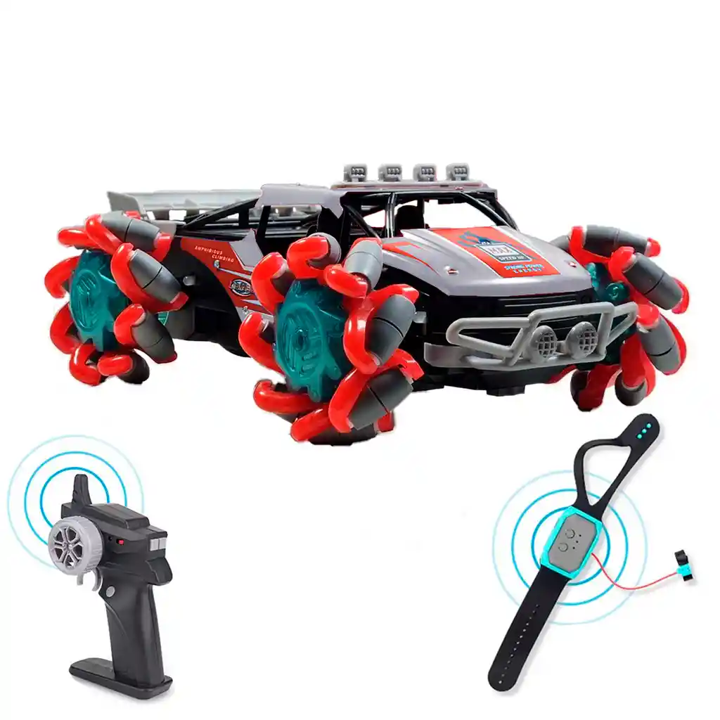 Potente camioneta a control remoto con tracción en sus 4 ruedas, lo puedes controlar de dos formas: con su manilla de sensor de gestos o con su control remoto ergonómico con tecnología 2.4GHz que emite una señal fuerte y receptiva incluso a largas distancias. Su diseño está enfocado específicamente para movimientos de alto nivel, como giros de 360°, deriva en todas las direcciones, escalada incluso en terrenos de superficies irregulares como arena, césped, asfalto gracias al diseño único de sus ruedas todoterreno. Fabricado con plástico ABS duradero y ecológico, sumado a su estructura interna lo hace inmune a golpes no inducidos por el hombre. Además cuenta con efectos musicales dinámicos e iluminación LED vibrante, que no solo lo hacen un vehículo resistente sino atractivo y único. ¡El juguete adecuado para niños y niñas que quieren divertirse en exteriores alejados de las pantallas y en busca de aventuras! El auto de acrobacias viene con una batería recargable de iones de litio de 3.7 V (incluida en el paquete). Se puede cargar completamente y proporcionar aproximadamente 30 minutos de uso continuo. Ten en cuenta que el control remoto de mano requiere dos baterías "AA" (no incluidas), y la manilla controladora sensor de gravedad requiere dos baterías "AAA" (no incluidas). ESPECIFICACIONES: - Avance, retroceso, se mueve a la izquierda y la derecha - Luces de colores, efectos musicales - Llantas adherentes al terreno - Subida con brazo oscilante - Caminar boca abajo - Giro de 360° - Caminar hacia atrás - La manilla controladora admite el control de gravedad por gestos - Distancia de control remoto y manilla controladora: Alrededor de 30 a 50 metros - Duración de batería: Alrededor de 30 a 45 minutos. - Tiempo de carga: Alrededor de 90 a 120 minutos. CARACTERÍSTICAS: 1. camioneta de acrobacias y luces LED, todoterreno a control remoto, tracción en las 4 ruedas, recargable, carro de juguete para niños, adolescentes y adultos. 2. Puede deformar su cuerpo, esto lo ayuda a esquivar obstáculos más fácilmente. 3. Se puede mover en cualquier dirección ya sea en diagonal, horizontal o vertical y de adelante a atrás, conducción y giro flexibles. Supera rápidamente todos los obstáculos. Un juguete de coche de control remoto ideal para niños y adultos. 4. Control remoto y manilla controladora de 2.4 GHz. Control remoto de larga distancia y manilla controladora de 30 a 50 metros, tecnología anti interferencia mejorada, para garantizar la diversión de explorar sin límites El paquete incluye: 1 * Carro control remoto todoterreno 1 * Control remoto 1 * Manilla controladora 1 * Batería de 3,7 V 1 * Cable de carga USB 1 * Manual de instrucciones