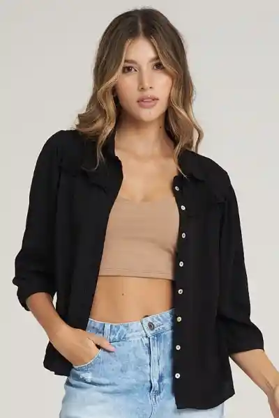 En Chalís Fondo Entero Cuello Camisero Perilla en Centro Frente Almillas Delanteras Con Ruche Decorativo Manga 3/4 Con Recogido Silueta Semi Ajustada.