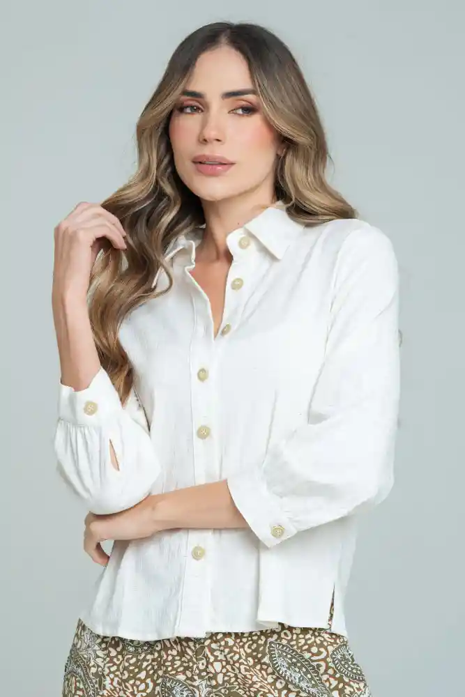 Camisa en tejido plano fondo entero, cuello camisero, perilla en centro frente con botones 24L, manga 3/4 con puño en ruedo con botón 24L, aberturas de 6cms a lado y lado del ruedo, ruedo de 0.8cms, silueta semi ajustada.