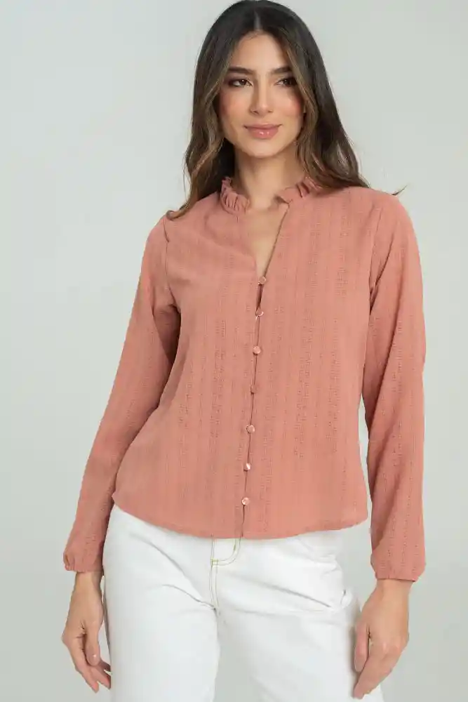 Camisa en tejido plano fondo entero con una textura especial, cuello con ruche en la misma tela, escote en V en la parte delantera, botonado en centro frente con botones de pata tono a tono, manga larga con puño resortado con elástico de 1cms.