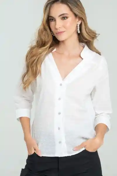 En Tejido Plano Fondo Entero Con Textura Especialcuello Nerú Escote en V Con Perilla en Centro Frente Con Botón 18L Corte Con Recogido Suave en la Parte Delantera Manga 3/4 Con Puño de 3.5 cm Con Abertura en Los Laterales Silueta Semi Ajustada