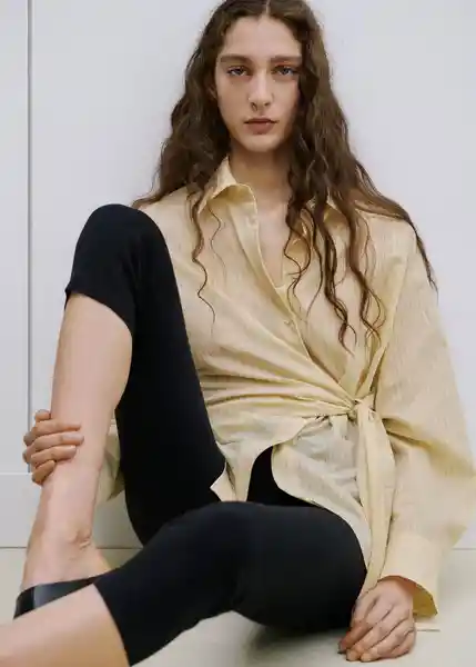 Cierre Delantero Con Botones Cuello Camisero Detalle de Nudo en la Cintura Diseño Largo Diseño Recto Estampado de Rayas Manga Larga Abotonada Con Puños a Contraste Tejido de Algodón - 27084082_11.