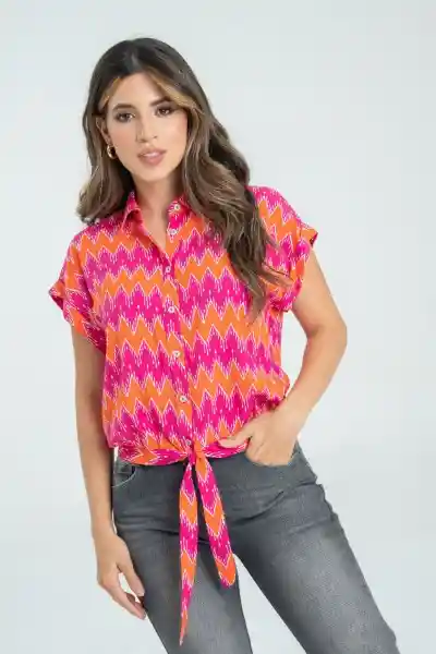 En Tejido Plano Estampado Cuello Camisero Perilla de 2 cm en Centro Frente Con Botones de 18L Manga Corta Rodada Con Guardapolvo en Ruedo Fijo Con Puespuntes Fajón en Ruedo Que Anuda en la Parte Delantera y va Enresortado Con Elástico.