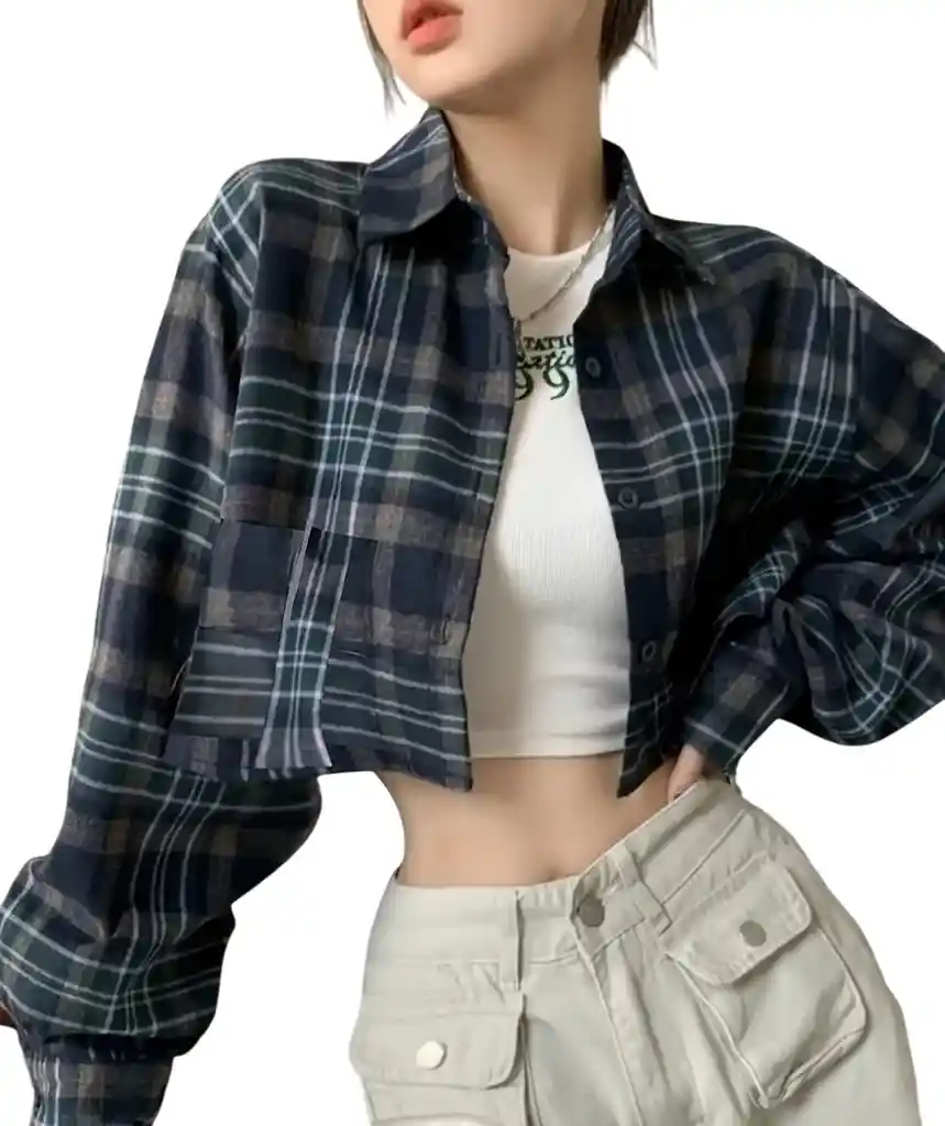 Camisa de Cuadros Corta color Negro y Verde oscuro Tipo Chaqueta corta. Sobrecamisa. Talla Unica, Aproximada S. Medida de largo: 40.5 centimetros