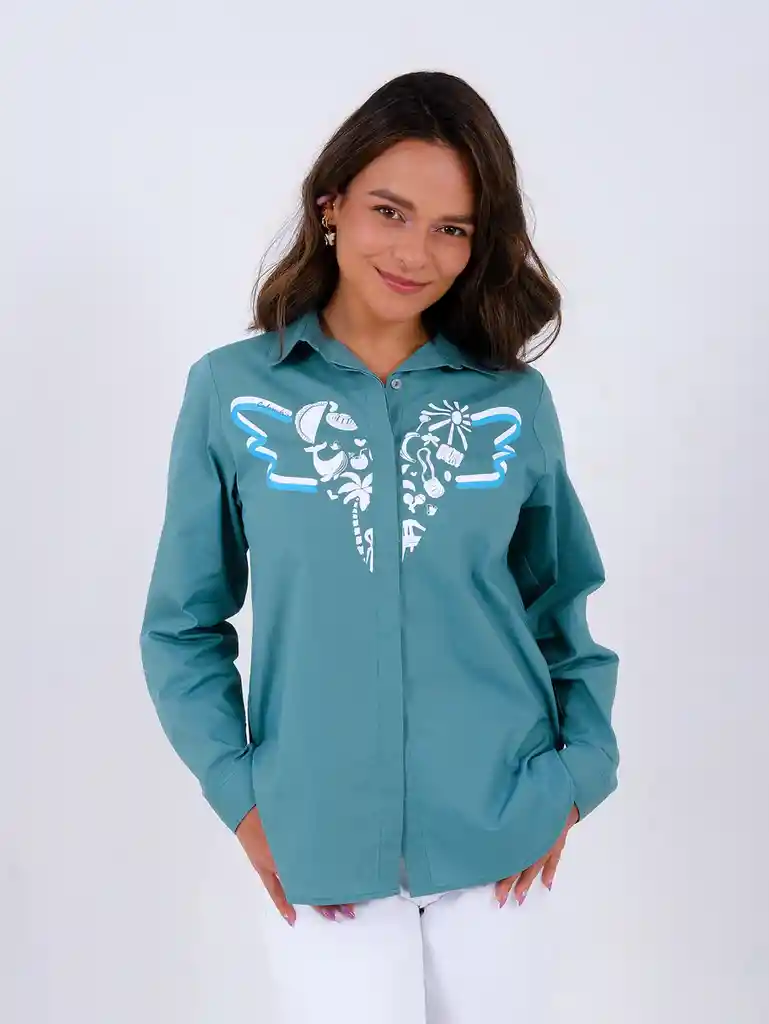 Camisa azul. Estampada en el frente con un corazón con alas relleno de elementos de la cultura popular colombiana. En la espalda tiene la frase «Te llevo en mi corazón»