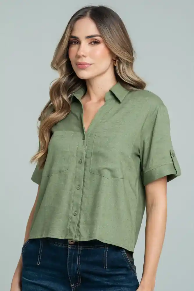 Camisa en lino, con cuello y perilla completa de botones 18L tono a tono, manga corta con bolsillos parche en frente, guardapolvo con charretera decorativa en mangas, almilla en posterior con prense decorativo en centro espalda, silueta amplia.