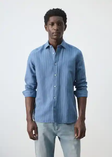 Bajo Redondeado Diseño de Rayas Finas Largo Standard Manga Larga Con Puños Abotonados Regular Fit Tejido Mezcla de Lino y Algodón - 27055941_55.