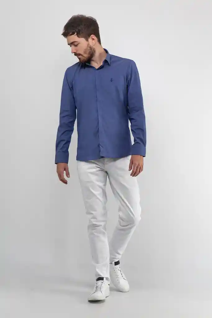 CAMISA SLIM FIT MANGA LARGA COLOR AZUL PETRÓLEO. CARTERA ESCONDIDA. 97% ALGODÓN-3% POLIÉSTER. HECHA EN COLOMBIA.