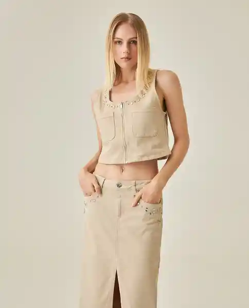 Tank Femenina Slim Fit Cuello Redondo Amplio Manga Sisa en Algodón 99% y Elastano 1%. Lavado Crudo. Dos Bolsillos de Parche Delanteros. Cierre Separable. Piedras Brillantes en Escote. Aplique Tipo Placa en Posterior. Parte de Set Con Falda Midi (Misma Tela Lavado Crudo Bolsillos Piedras Decorativas Garra Cuero en Pretina 99% Algodón 1% Elastano). Elongación Aproximada: 2%. Ean- 411H001Cru130000 Plu- 1111133246933.