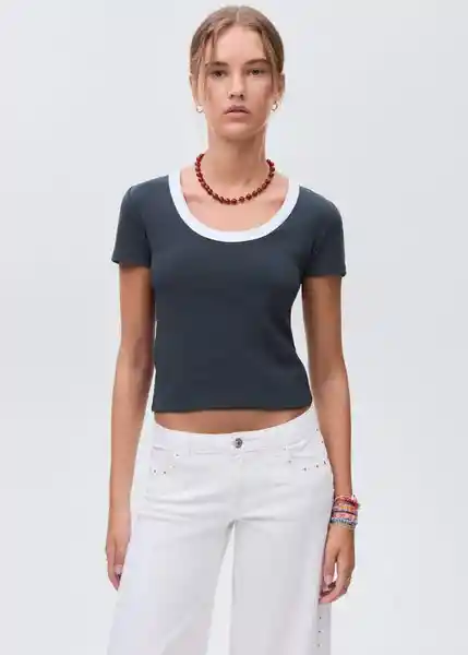 Cuello en Contraste Cuello Redondo Detalle de Abertura en la Parte Posterior Diseño Recto Efecto Top Estilo Crop Manga Corta Tejido de Algodón Orgánico - 17043335_56.