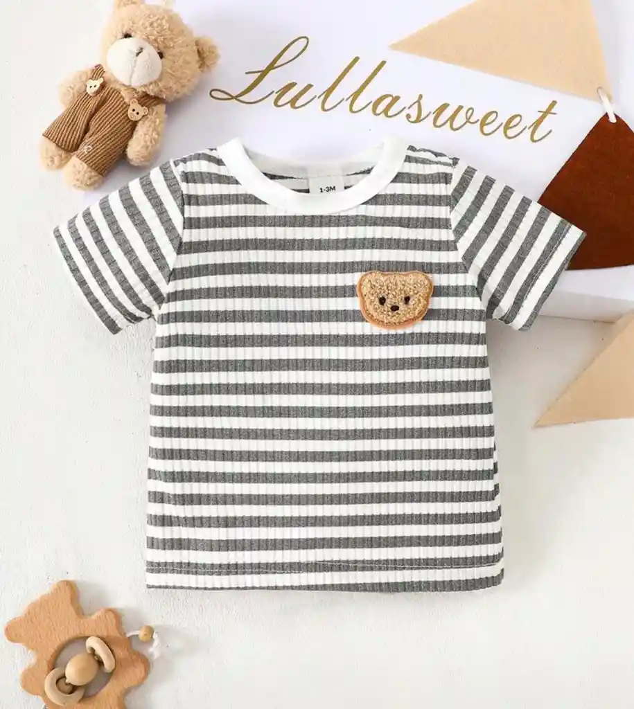 Talla disponible recien nacido , 0 a 3 meses Comodidad y ternura en cada detalle! Esta camiseta básica es la prenda perfecta para el uso diario de tu bebé, diseñada para ofrecer suavidad y libertad de movimiento. • Textura Premium Rib: Confeccionada en algodón acanalado que se estira suavemente, facilitando el cambio de ropa y brindando un ajuste perfecto. • Detalle Encantador: Incluye un tierno parche de osito en relieve que le da un toque especial y divertido al diseño clásico de rayas. • Frescay Transpirable: Material ideal para mantener al bebé fresco durante el día, ya sea para jugar o para una siesta cómoda. • Fácil de Combinar: Su diseño en tonos neutros (gris y blanco) la hace perfecta para usar con jeans, pantalones de sudadera o debajo de un overol.