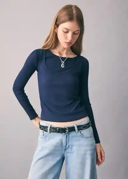Camiseta de Algodón Cuello Redondo Detalle de Doble Capa Diseño Recto Manga Larga - 17017778_56.