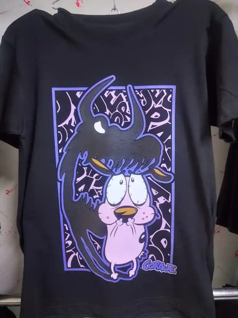 Lleva la valentía y diversión de Coraje en esta camiseta única. Tela cómoda y resistente Diseño original y colorido Disponible en varias tallas 💥 Perfecta para fans de la serie clásica.