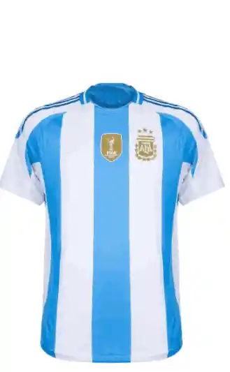 Esta es una camiseta de fútbol de la selección argentina, caracterizada por su diseño clásico de franjas verticales celestes y blancas. En la parte frontal de la camiseta se aprecian varios elementos distintivos: - Diseño Principal: El cuerpo de la camiseta se compone de franjas verticales alternas en color celeste y blanco, un patrón icónico y fácilmente reconocible. - Emblema de la AFA: Ubicado en el lado derecho del pecho (desde la perspectiva del observador), se encuentra el escudo de la Asociación del Fútbol Argentino (AFA). Este escudo es de color dorado y está coronado por tres estrellas doradas, que simbolizan las tres Copas del Mundo ganadas por la selección argentina.
