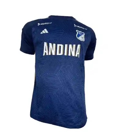 - En la parte superior de la espalda: "CAFAM" en blanco y "FALCAO" en dorado. - En el centro de la espalda: El número "9" en dorado con un borde blanco. - En la parte inferior de la espalda: "wplay.co" en blanco. Estos elementos suelen ser el patrocinador principal (CAFAM, wplay.co), el nombre del jugador (FALCAO) y su número (9).