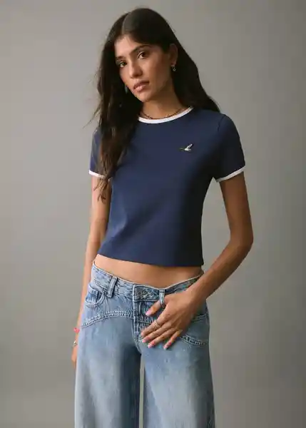 Cuello Redondo en Contraste Dibujo Bordado en el Pecho Diseño Bordado Diseño Entallado Manga Corta Tejido de Algodón - 17068269_56.