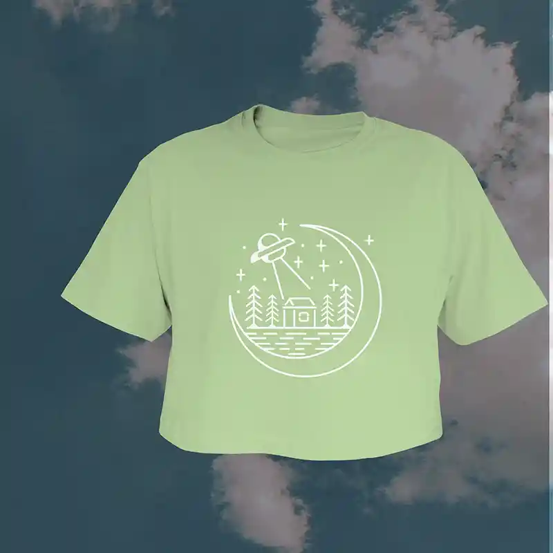 Camiseta femenina color verde menta, tela 100% algodón, estampado paisaje con ufo, al frente centro