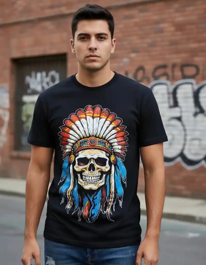 Camiseta Indio Calavera Neón Camiseta Para Hombre Calavera Camiseta en algodón ideal para cualquier clima, caliente, frio, medio, es muy fresco su material. El cuello es redondo, con costuras reforzadas. Color negro, la horma de la camiseta es clásica, sirve para hombre y para mujer estampado full serigrafía, muy buena durabilidad con un estampado de un hermoso Indo Calavera en tonos neón, es un estampado de excelente calidad, durabilidad garantizada, tiene un pequeño estampado en la manga derecha en tonos blancos tambien. Producto elaborado en Colombia de muy buena calidad. La camiseta se envía en bolsa. Envíos a nivel nacional Disponible talla: M