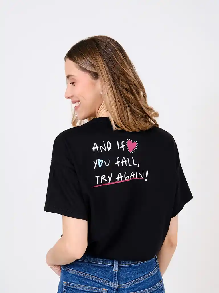 Camiseta oversize color negro de cuello redondo y manga corta, estampada en el frente y espalda