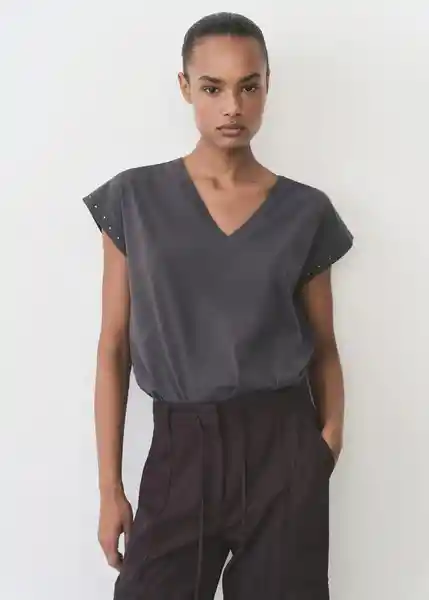 Cuello Pico Detalle de Tachuelas Diseño Recto Manga Corta Tejido 100% Algodón - 87045765_95.