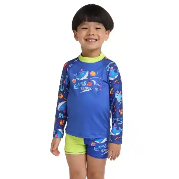 La Camiseta Protección Solar Dolphin Friends Bebé Masculino Para Niños de 2 a 6 Años Está Diseñada Con Los Más Altos Estándares Calidad Para Brindar Comodidad y Protección en el Agua y Bajo el Sol a Los Más Pequeños ya Que Cuenta Con Factor de Protección Upf 50 Que Bloquea el 98% de Los Rayos Del Sol Brindando Protección Uv (De Los Rayos Uvb y Uva). Una Camiseta Manga Larga Azul Vibrante Con Estampado Animado de Delfines y Logo Speedo Blanco. Con Diseño Multicolor de Animales Marinos en Las Mangas y Cuello Verde Limón Vibrante Una Prenda Ideal Para Los Pequeños Más Aventureros. Puede Usarse Como Conjunto Acompañado de Nuestra Pantaloneta de Baño Aquashort Dolphin Friends Bebé Musculino Para Brindar Protección Extra a tu Pequeño de Los Rayos Del Sol.