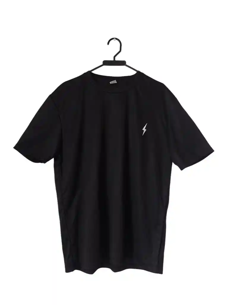 Camiseta Negra Talla XL Diseño Logo De Rayo. Camiseta Negra Talla XL con diseño minimalista de rayo, tela fresca, completamente nueva. Medidas: Largo: 75 Centimetros y de Axila a axila: 60 Centimetros.