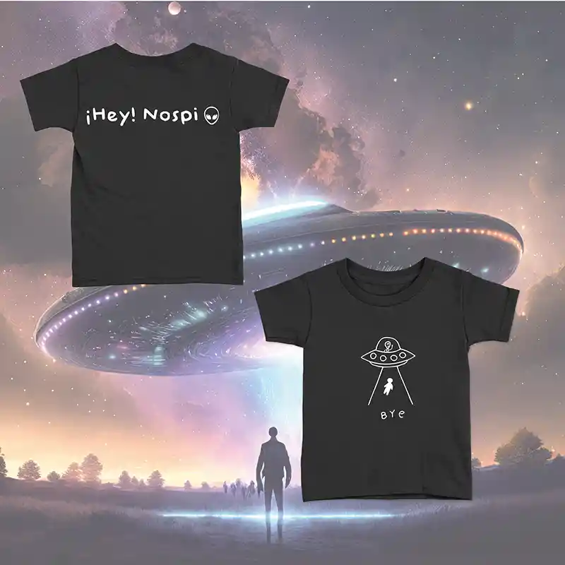 Camiseta de niño o niña, 100% algodón , color negro, estampado de ufo frente y hey nospi espalda.